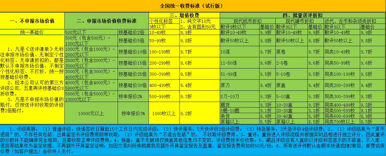 | 1、凡是《送评清单》无标注申报市场价值、无制定个性化标签、无申请折扣的,都是默认不申报市场价值、不制定个性化标签、不打折,统一按按基础价收费。 2、经本公司认可的第三方评级公司,五星再评按基础价8折收费。 3、凡是不申报市场价值的赔付,仅按送评时收取的评级费2倍赔付。 | 500元(包含500元)-1000元以下 | 按基础价5倍 | 50-99枚 | 9.8折 | 散评50枚以上 | 9.8折 | 散评50枚以上 | 9.8折 | 散评50枚以上 | 9.8折 |